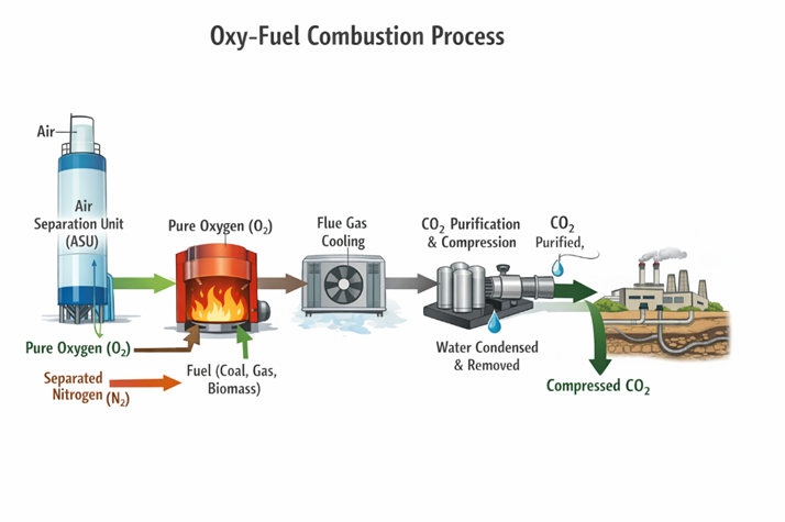 After water condensation, a concentrated stream of CO₂ is obtained, which simplifies capture and purification. Although oxygen production requires additional energy, the efficiency of carbon dioxide separation makes this method suitable for large-scale industrial applications.
