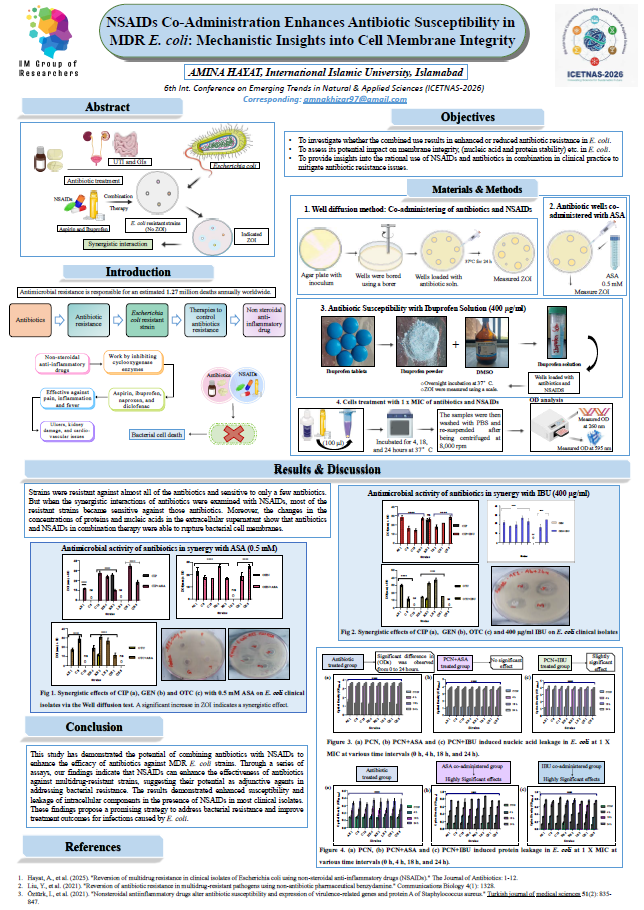 Graduate of the International Islamic University, Islamabad. Her research focuses on antimicrobial resistance, with particular emphasis on exploring non-antibiotic strategies to combat multidrug-resistant (MDR) bacterial pathogens. This work investigates the synergistic effects of non-steroidal anti-inflammatory drugs (NSAIDs) in enhancing antibiotic susceptibility in Escherichia coli by disrupting cell membrane integrity. Amina is interested in translational research aimed at improving therapeutic outcomes and addressing global challenges associated with antibiotic resistance.
